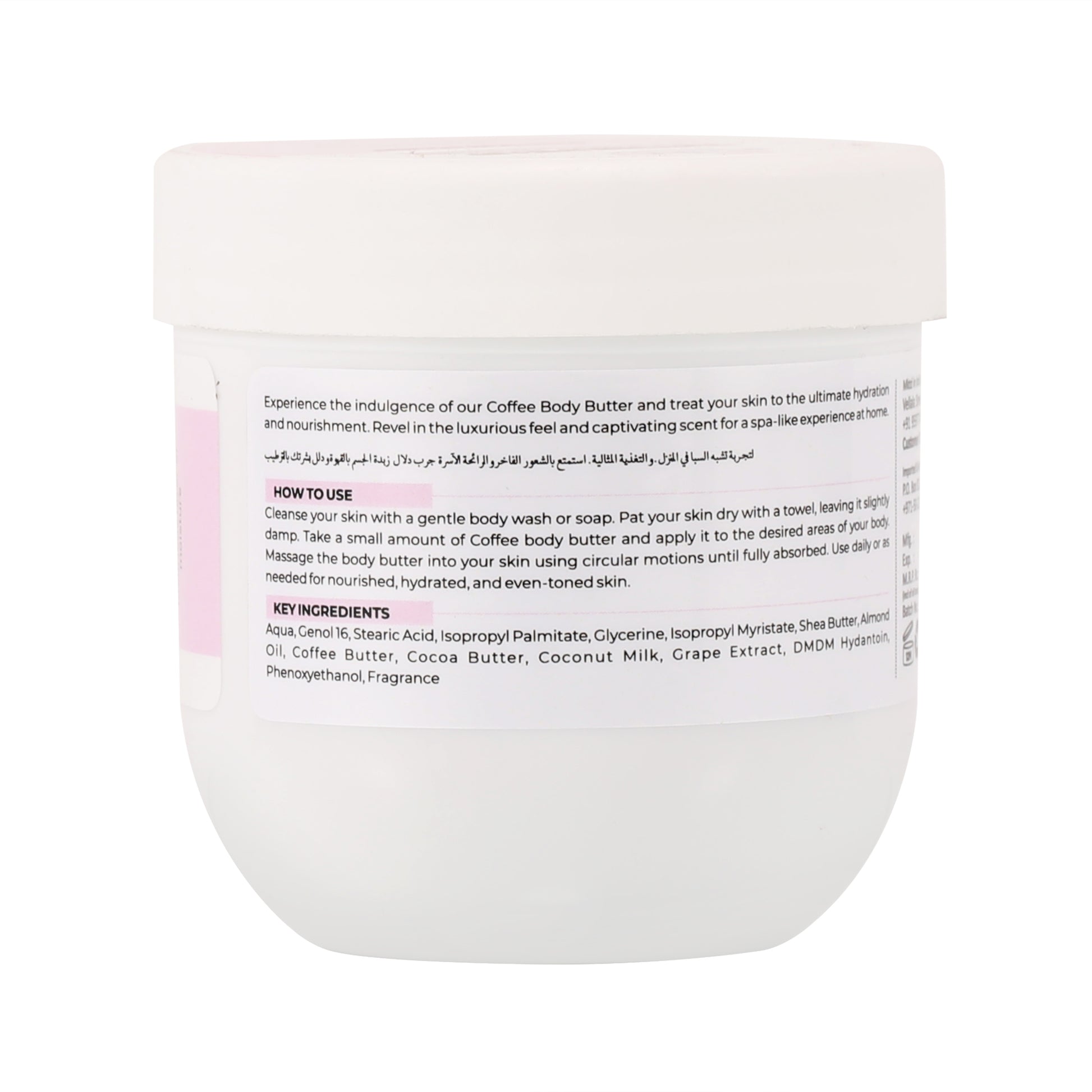 Firming and Toning: Coffee Butter helps to improve skin firmness and elasticity, while Cocoa Butter enhances skin texture and tone for a firmer, more youthful appearance.